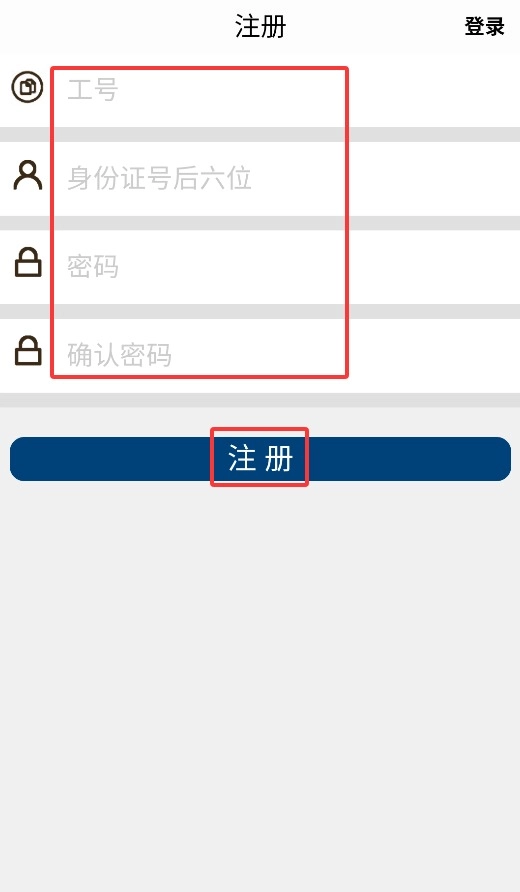 2、填写工号、身份证号后六位并设置密码,确认无误后即可完成账户注册。