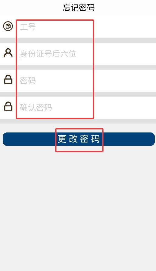 4、要是忘记了密码,可以在找回密码的页面输入工号和身份证的后六位,接着设置新密码并确认,这样就能完成密码修改了。