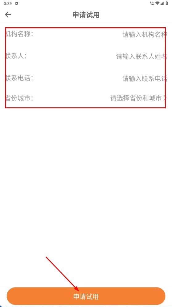 4、填写机构名称、联系人、联系电话、省份城市等信息,提交后即可完成试用申请。