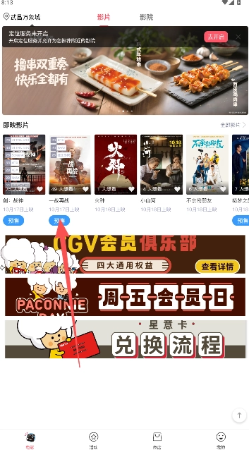 1、使用CGV电影购票时,需授予位置权限,以便系统查看你所在的城市,并为你推荐可购买电影票的场所。