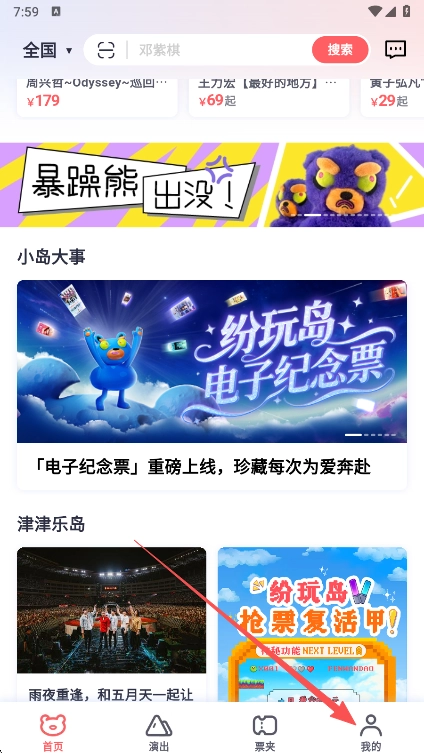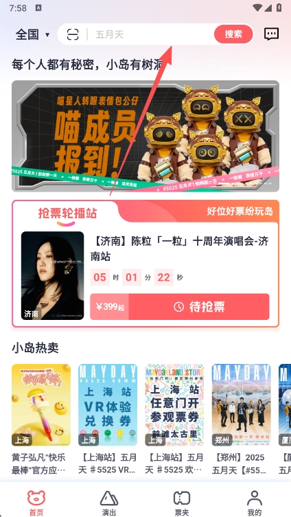 1、打开纷玩岛App,在首页找到抢票专区,或者通过顶部的搜索框输入想要抢票的演唱会名称。