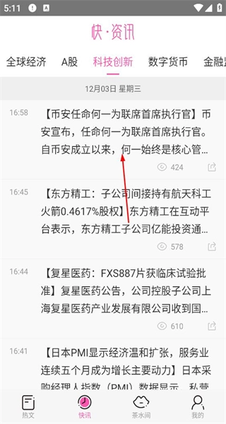 3、切换选择科技创新分类,查看该分类下的资讯列表,浏览如币安任命高管、东方精工投资等相关内容。