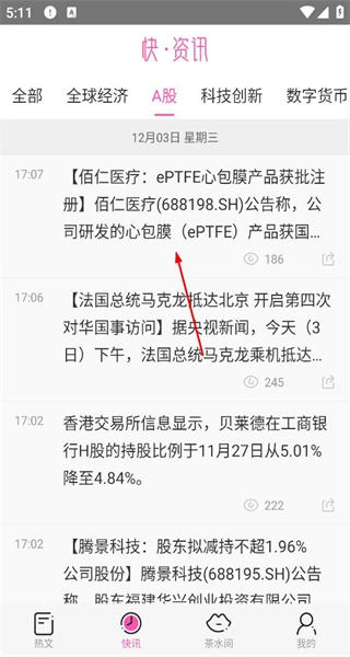 2、切换选择A股分类,查看该分类下的资讯列表,浏览如佰仁医疗产品获批、法国总统访华等相关内容。