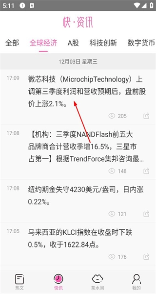 1、打开软件后,选择全球经济分类,查看该分类下的资讯列表,浏览如微芯科技上调预期、纽约期金等相关内容。