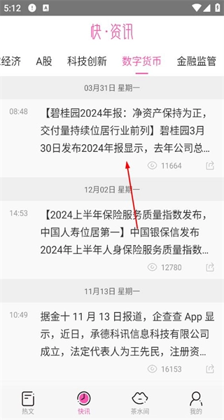 4、切换选择数字货币分类,查看该分类下的资讯列表,浏览如碧桂园年报、保险服务指数等相关内容。