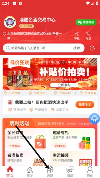 1. 打开酒酷名酒交易中心首页后,找到页面底部的【选酒】按钮并点击,即可进入选酒页面。