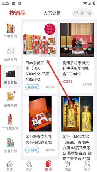 3、在热卖酒品列表里,挑选你想查看的目标酒品(例如“Plus会员专享(飞天500ml*2+飞天100ml*2)”),然后进入该酒品的详情页面。