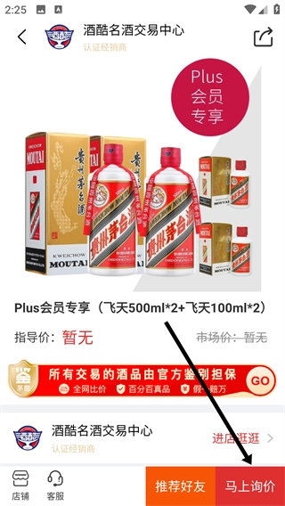 4、进入酒品详情页面后,点击页面右下角的【马上询价】按钮,就能发起该酒品的询价操作。