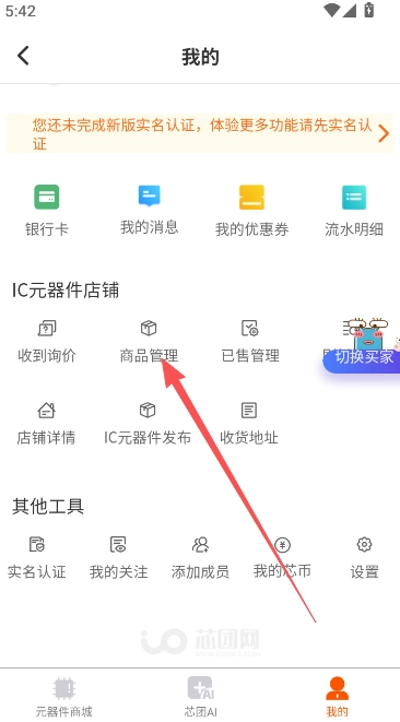 1、点击“我的”切换至卖家身份,随后在IC元器件店铺板块里找到并选择商品管理功能。