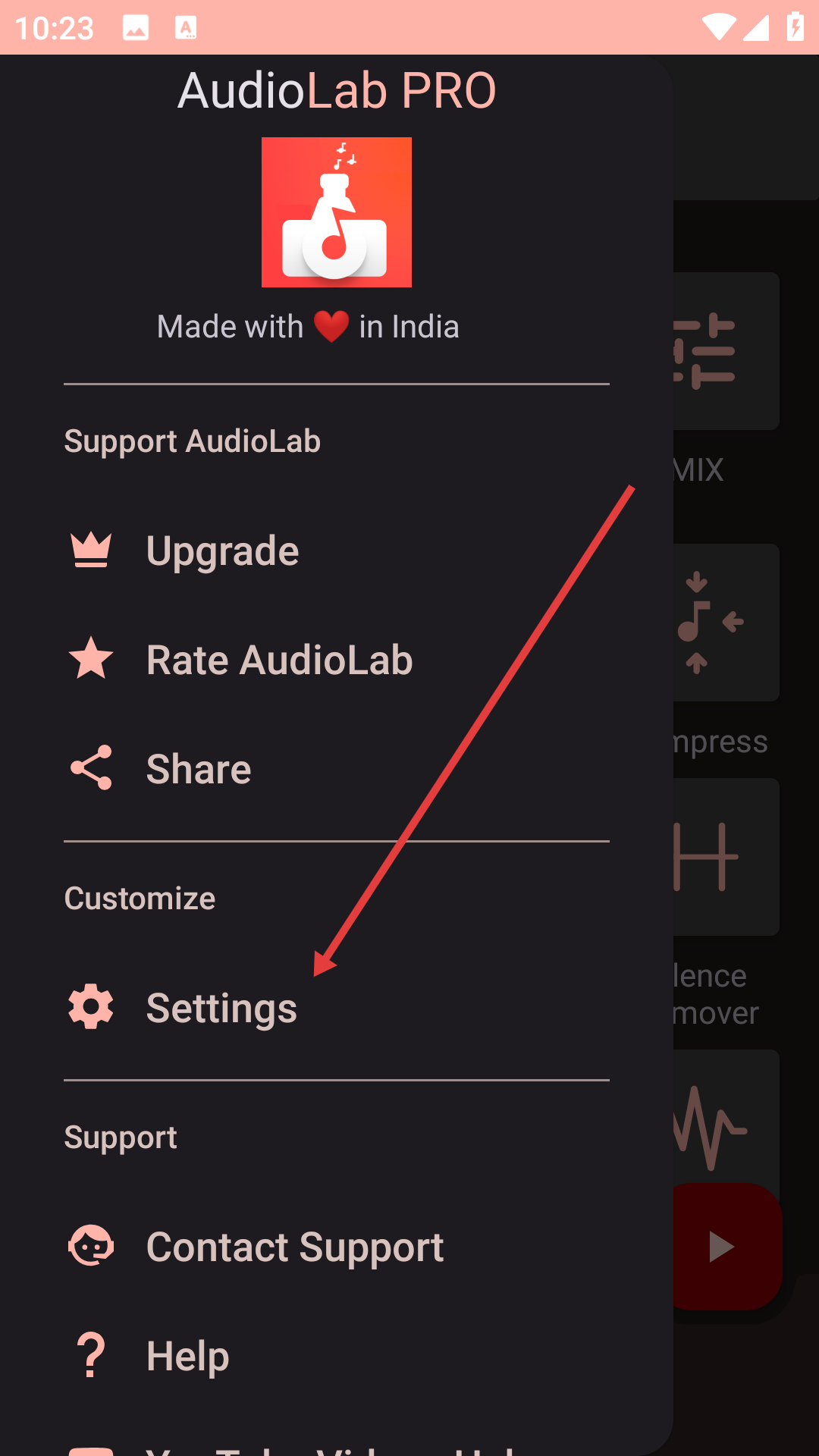 点击底部菜单按钮后,侧边栏会展开,在其中可以查看【Upgrade】【Rate-AudioLab】【Settings】等功能选项。