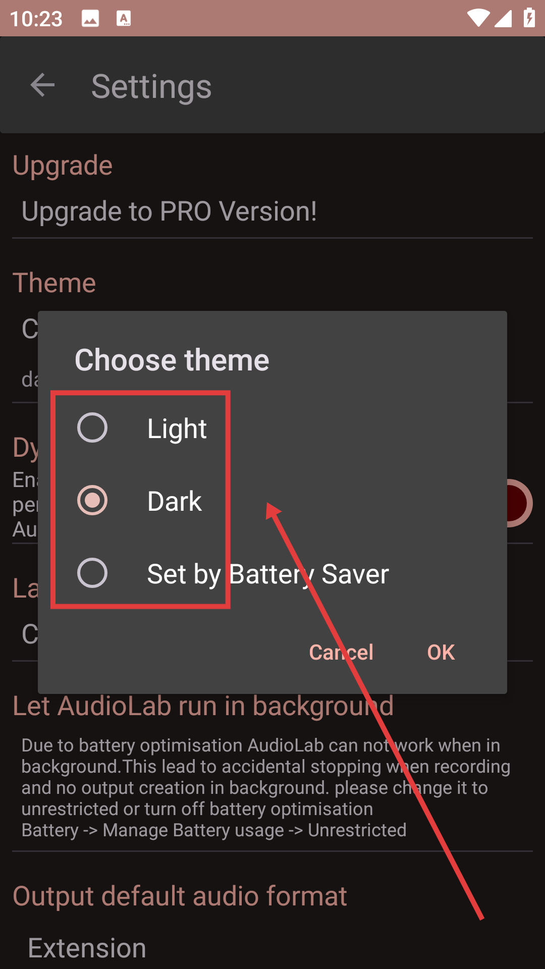 4、在主题选择弹窗里,能够挑选【Light】【Dark】【Set-by-Battery-Saver】这几个主题,选好之后点击【OK】按钮来确认完成设置。
