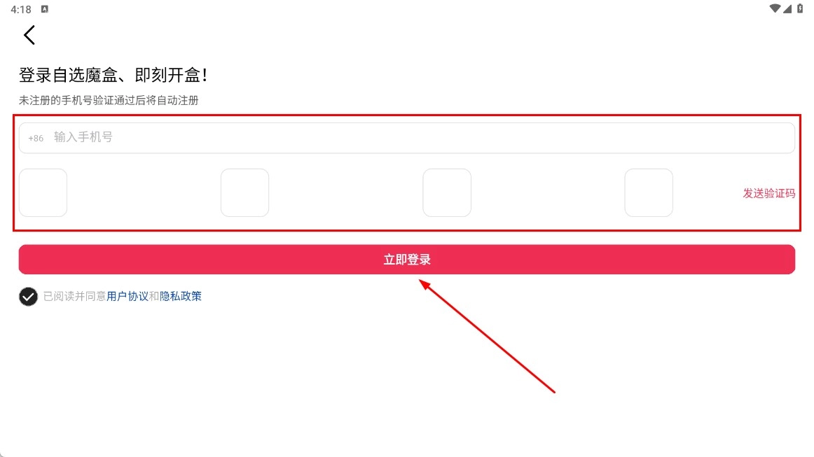 2、在登录页面输入手机号和验证码,点击【立即登录-功能按钮】完成登录。