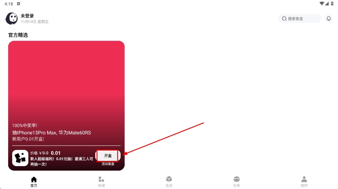 3、登录后在首页,点击【开盒-功能按钮】,参与新人福利抽奖活动。