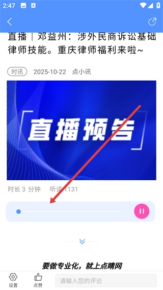 3、在点睛时讯页面找到类似【直播|邓益州:涉外民商诉讼基础律师技能-重庆律师福利来啦~】这样的内容并点击,即可进入详情页。