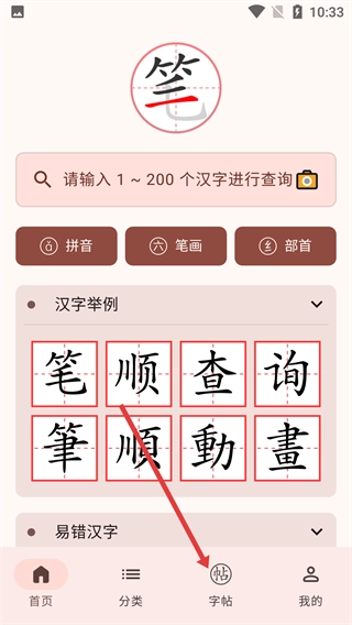 1、打开【笔顺笔画大全】首页,点击底部的【字帖】按钮,就能进入字帖选择页面。