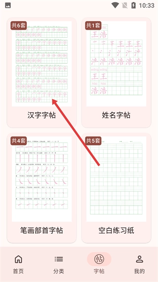 2、进入字帖选择页面后,点击【汉字字帖】这一选项,即可跳转至汉字字帖的详情页面。