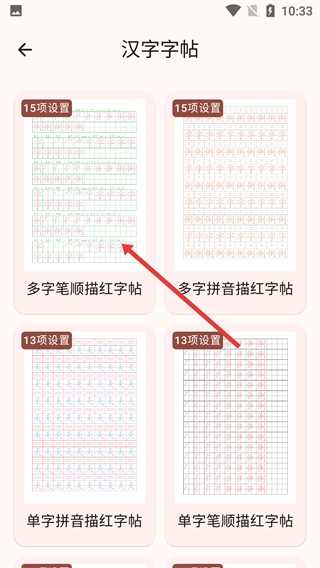 3、进入汉字字帖页面后,点击【多字笔顺描红字帖】选项,即可进入该字帖的详细页面。