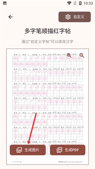 4、在多字笔顺描红字帖页面,点击【生成图片】或【生成PDF】按钮,即可获取字帖对应的图片或PDF文件。
