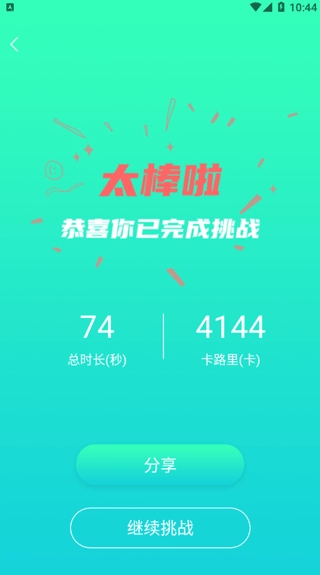 5、完成当日挑战后,既能查看本次运动的能量消耗数据,也可以进行打卡并分享运动成果。