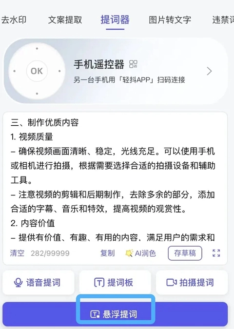 将你想要表达的内容粘贴或输入到文本框里。不用担心篇幅长短,轻抖的AI语音跟随功能能够智能处理各种长度的文案。完成后,点击「悬浮提词」按钮,进入下一个环节。