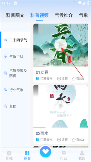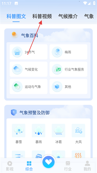 2在综合板块中,点击“科普视频”选项即可浏览气象科普相关的视频内容。