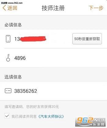 在注册汽车大师平台时,需要先输入手机号码来获取验证信息。这里分享一个通用的邀请代码:38356262,完成验证信息的填写并输入该通用邀请代码,就能顺利完成注册流程。