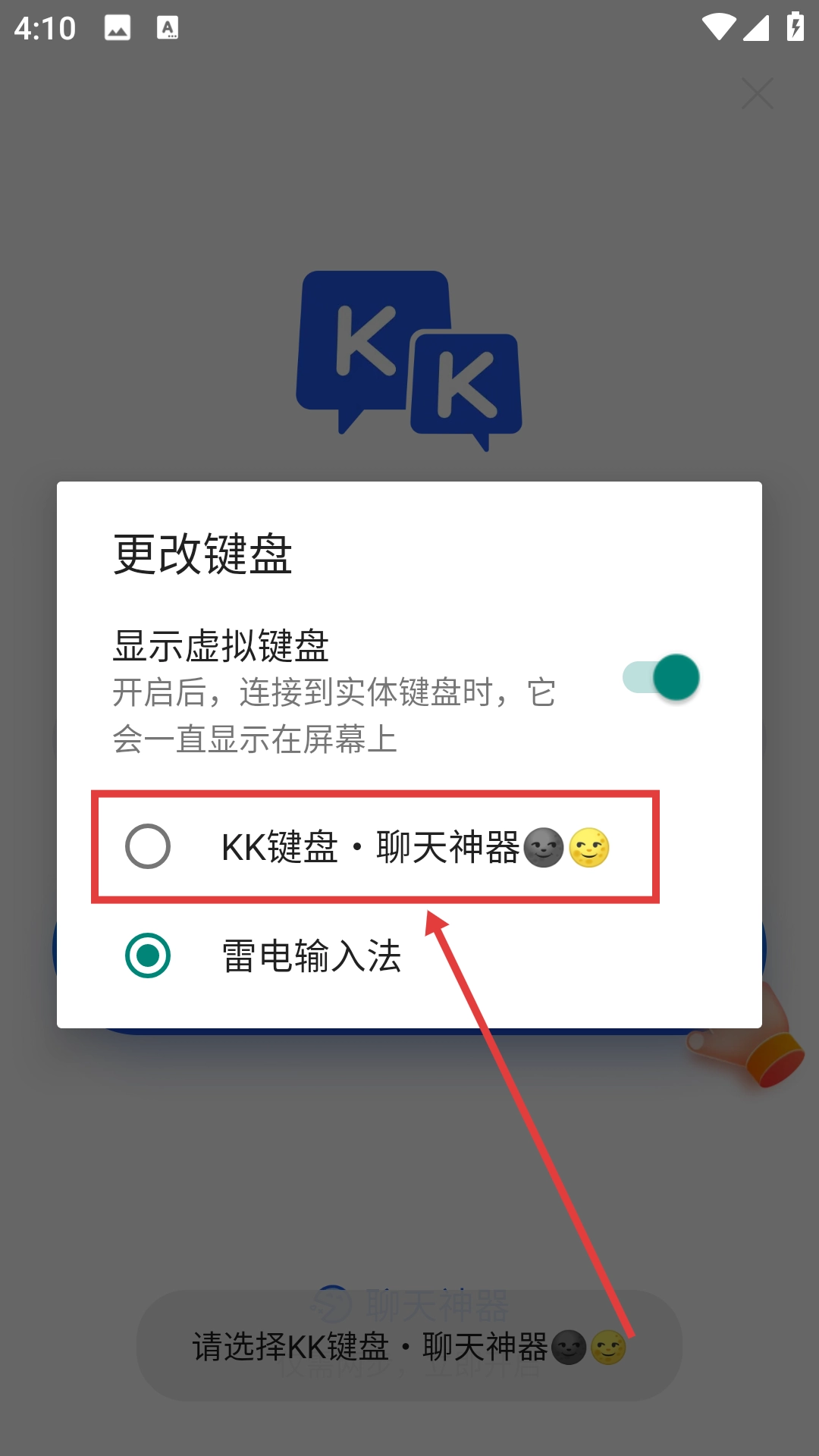 4、在键盘更换的弹窗里选中【KK键盘·聊天神器】,即可完成键盘的切换操作。