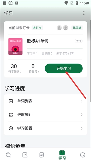 2、进入学习页面后,点击【开始学习】按钮,即可进入单词学习环节,开始学习当日的德语单词。