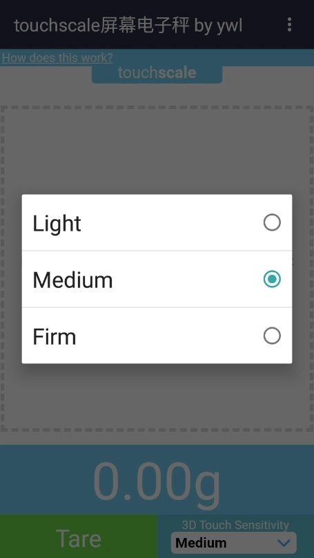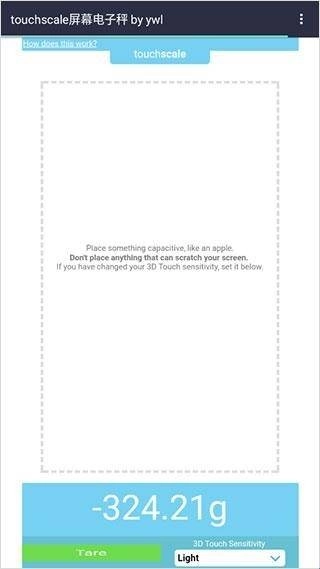 touchscale屏幕电子秤是一款非常智能的手机电子秤软件,在日常生活中,可能会遇到一些想要称量一些物品,但却暂时没有称量工具的情况,使用这款软件可以随时随地称量你想称量的物品的重量,软件使用非常简单,只需要打开软件后,按照软件提示将物品放在手机指定位置,就可以称量物品重量,称量过程快速方便,称量结果精度准确,测量范围广阔,基本无误差,只要不将手机压坏的物品都在可称量范围内,且冷热感应明显,可以即使做出提醒。