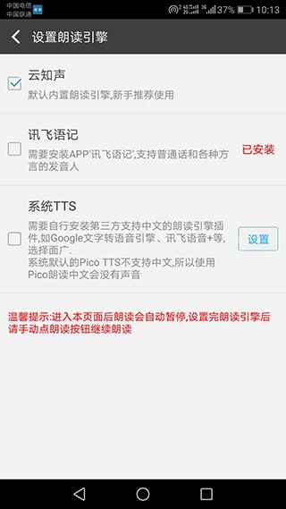 4、在设置界面里,您还能挑选朗读引擎;文字朗读神器兼容多种朗读引擎,像云知声、讯飞语记以及系统TTS都包含在内;不同引擎各有其独特的特性与长处,您可依据自身的实际需求来选定适宜的引擎;