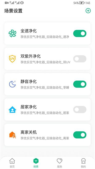 4. 点击页面下方的“场景”选项,就能进入场景设置功能界面,在此可以添加新的智能场景,也能对已有的智能场景进行管理。