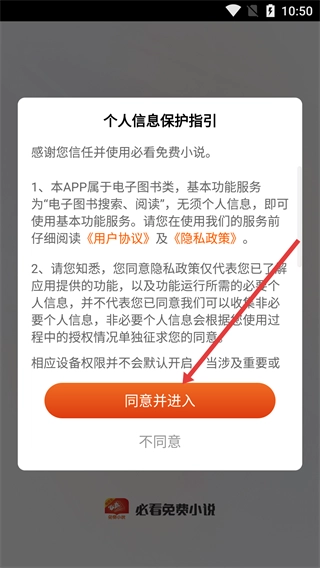 1、进入必看免费小说时,会弹出【个人信息保护指引】弹窗,点击【同意并进入】按钮,就能进入主界面。