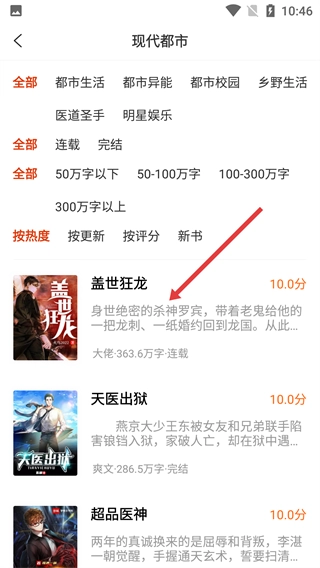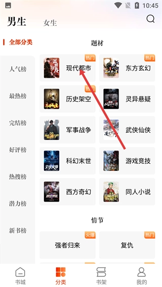 3、在小说分类页面,点击【现代都市】分类选项,即可进入现代都市小说列表页面。