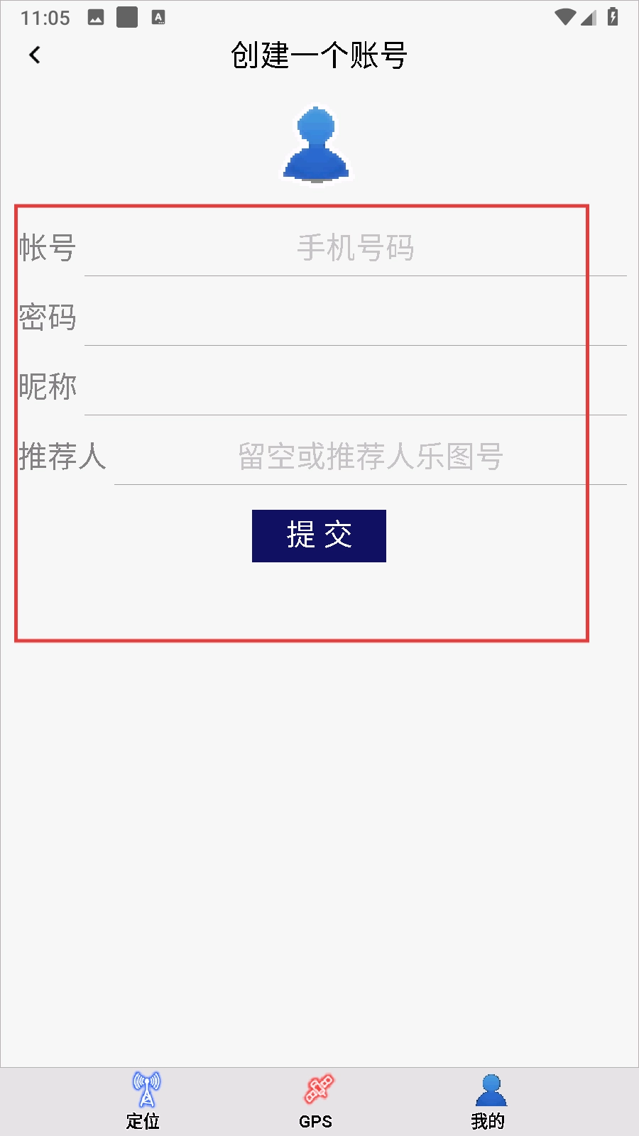 4、在创建账号页面,填写好手机号码、密码、昵称和推荐人信息后,点击【提交】按钮即可完成注册。