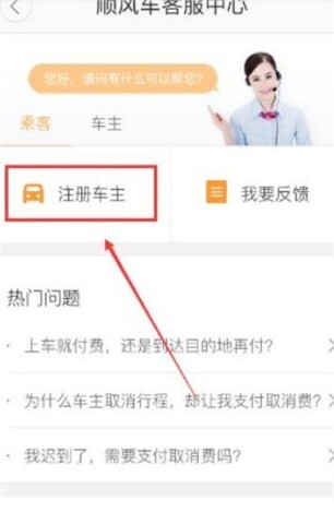 2接下来要进入顺风车客服中心相关页面,找到并点击车主选项,之后在新出现的选项里选择注册车主这一项。