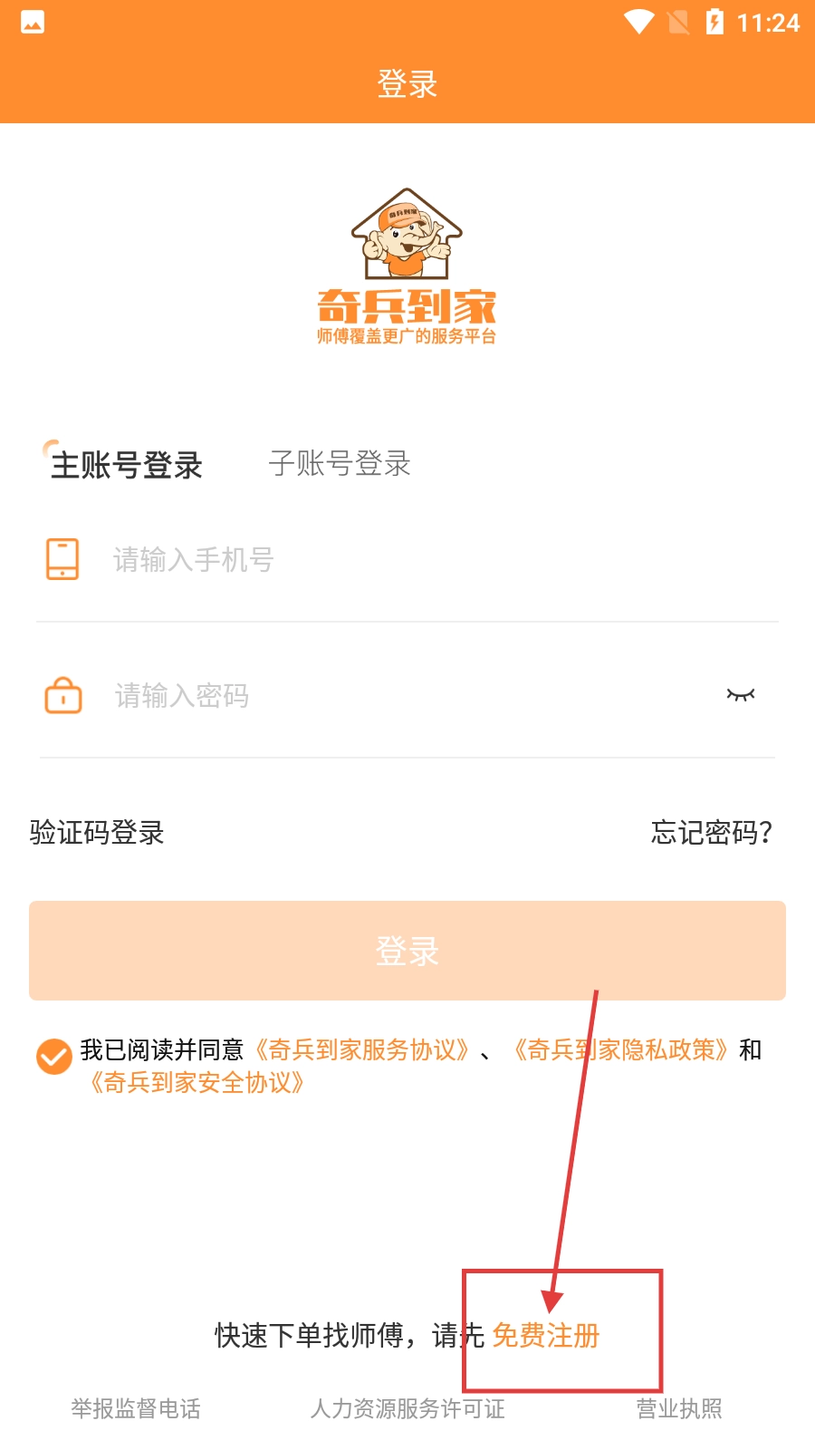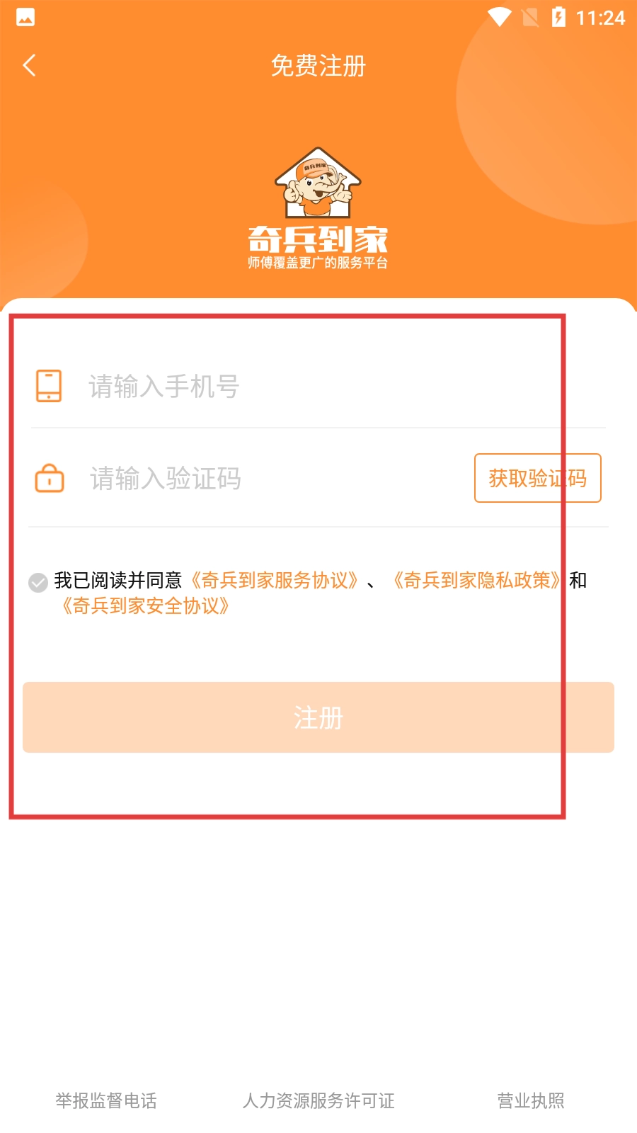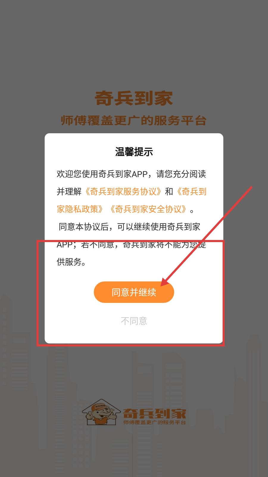 1、在奇兵到家的温馨提示界面,点击【同意并继续】按钮,可进入登录界面。