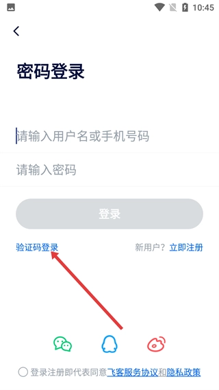3、进入登录页面后,找到并点击【验证码登录】选项,即可切换至验证码登录模式。