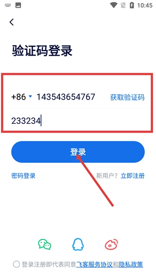 4、进入验证码登录页面后,依次填写手机号与验证码,接着点击【登录】按钮,就能完成登录流程。