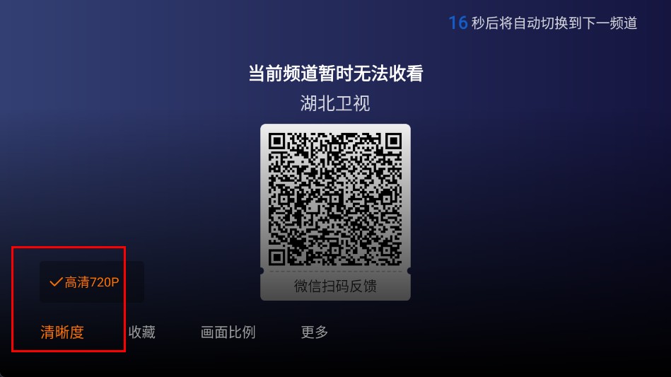 3、在频道页面可以点击【清晰度】功能选项,从中选择高清720P等画质。