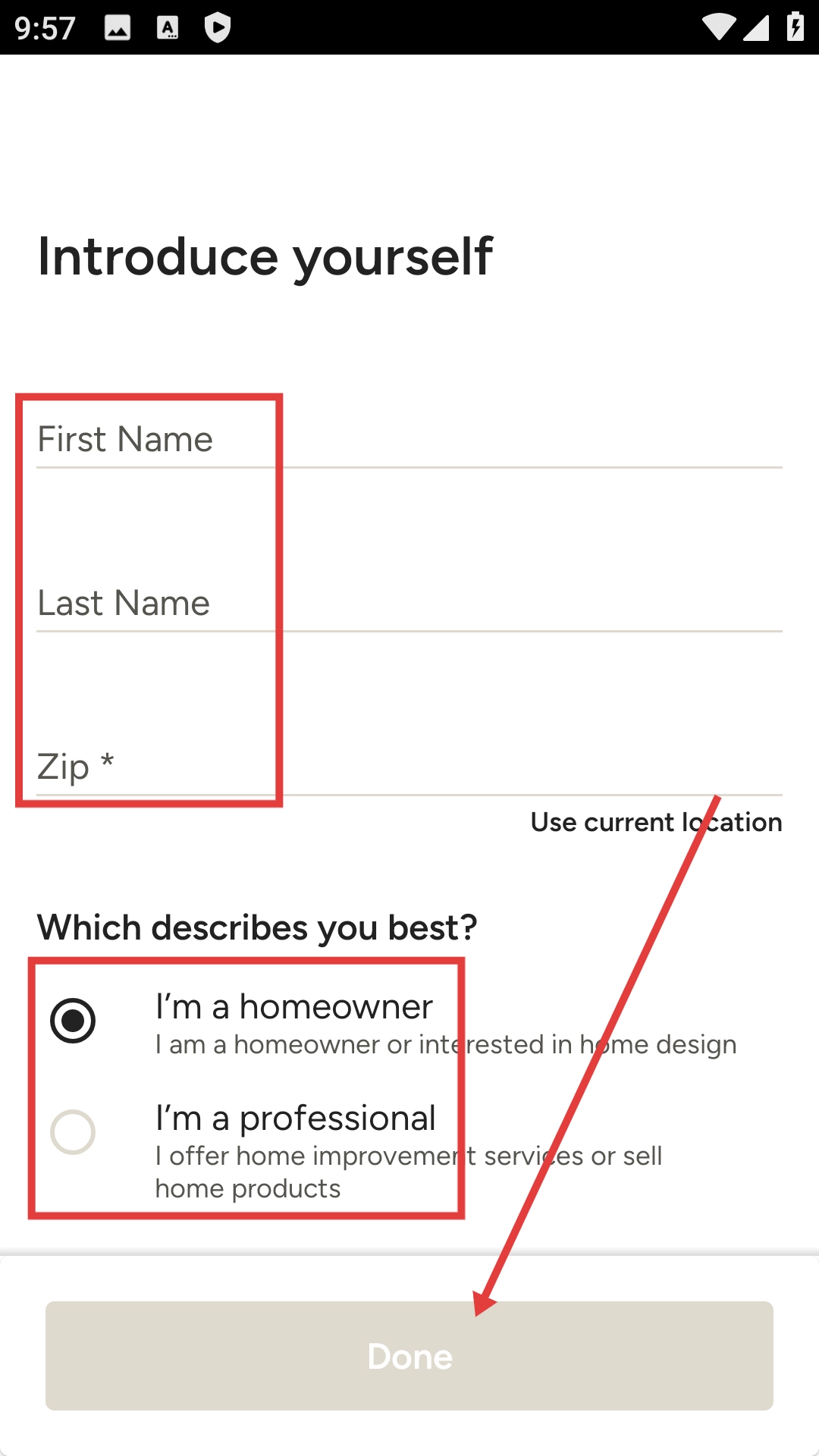 4、在自我介绍界面依次填写【FirstName】【LastName】【Zip】信息,选定对应的身份类型后,点击【Done】按钮,即可完成整个注册流程。