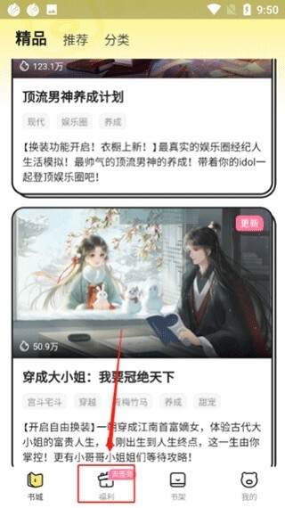 1、打开点点穿书,点击“福利”