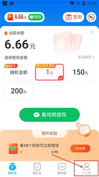1、在赚钱类首页,点击右下角“个人页”,进入个人中心页面。