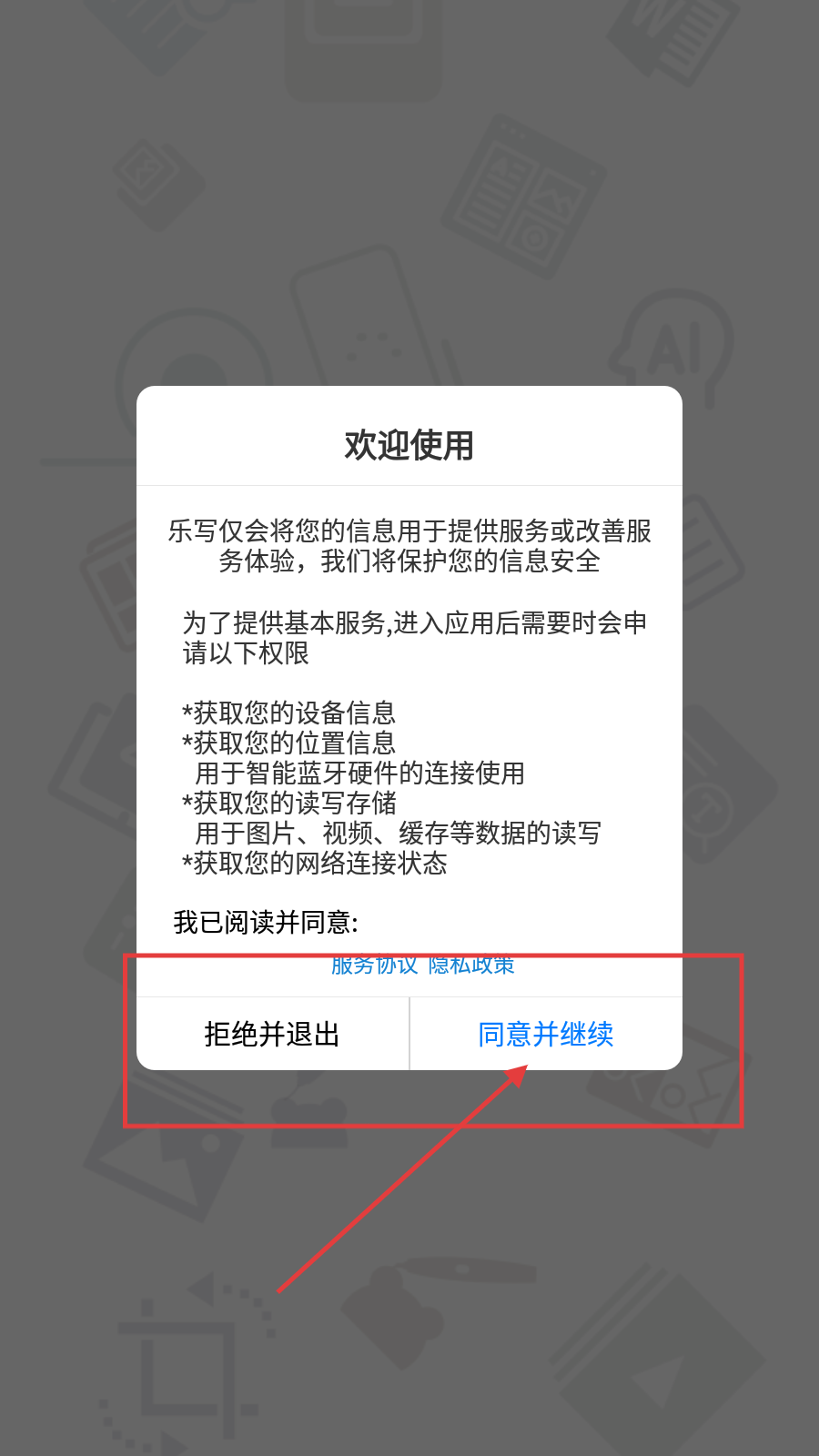 1、首次使用乐写,需阅读并同意《服务协议》和《隐私政策》,点击【同意并继续】进入应用。