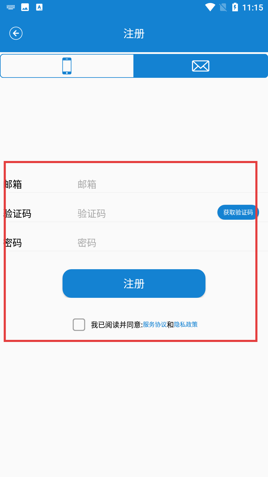 4、也可选择邮箱注册,填写邮箱、获取并填写验证码,设置密码,勾选同意协议后点击【注册】即可完成注册。