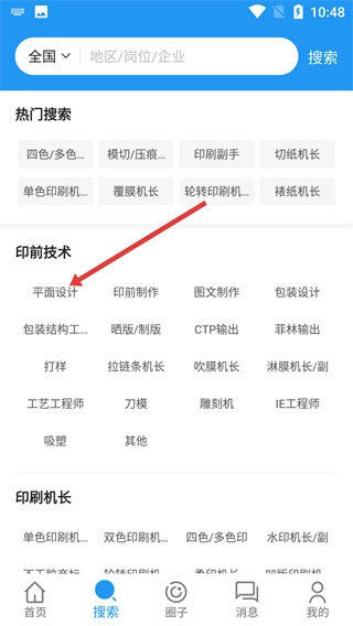1、打开软件首页后,点击底部的【搜索】按钮进入搜索页面,在该页面能看到热门搜索、印前技术等各类分类入口。