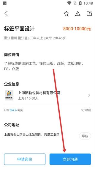 4、进入岗位详情页面后,点击【立即沟通】按钮,就能和企业HR交流岗位相关的问题,从而推动求职流程的进展。