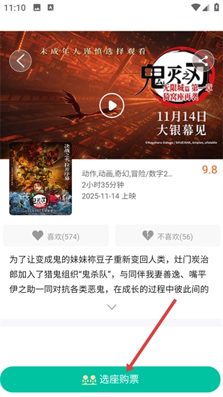 1、进入购票页面后,点击你想了解的目标电影(例如【鬼灭之刃-无限城篇】),就能进入该电影的详情页,在详情页里可以查看这部电影的评分、剧情介绍等相关信息。