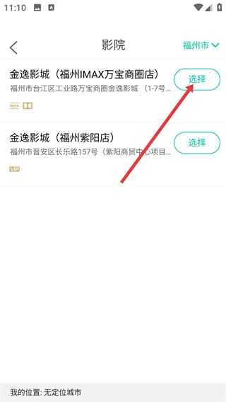 3、在影院列表里,找到目标影院(例如【金逸影城-福州IMAX万宝商圈店】)并点击其对应的【选择】按钮,即可进入该影院的场次页面。