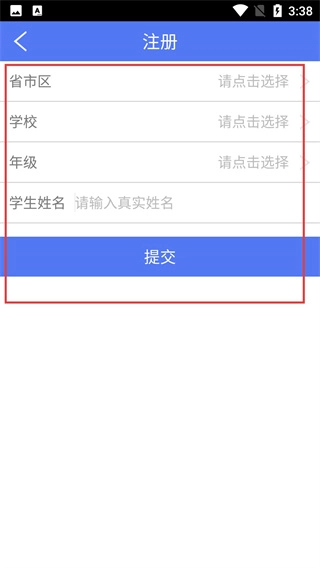4、注册界面需按顺序选择【省市区】【学校】【年级】,填写真实学生姓名后,点击【提交】按钮即可完成注册流程。