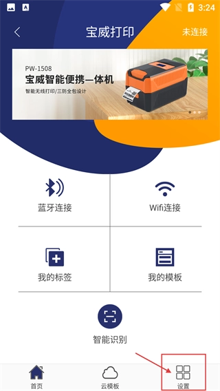 1、在宝威打印首页,点击底部【设置】进入功能页,页面支持蓝牙/WiFi连接打印机,还可管理标签与模板。